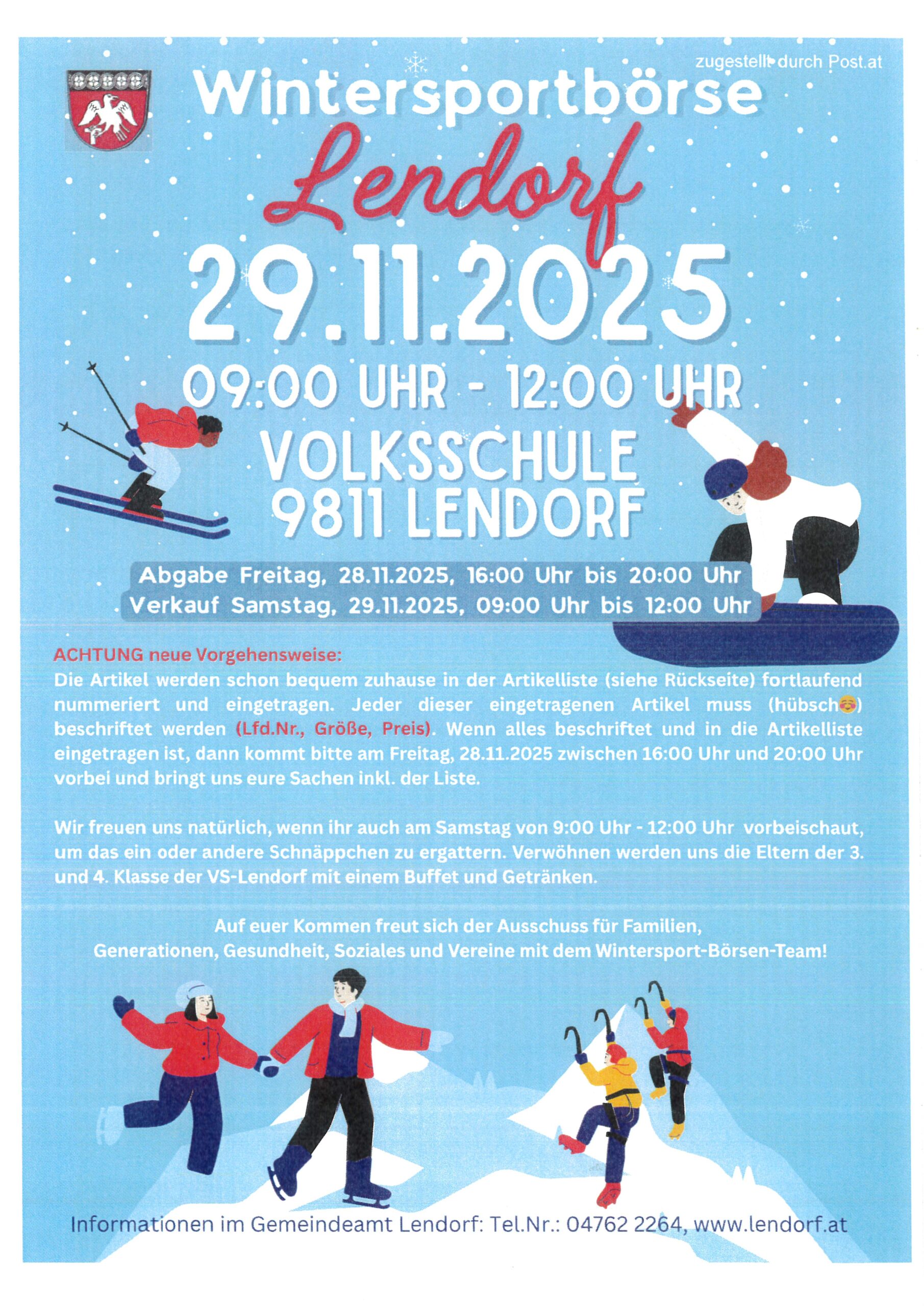 Am Samstag, 29. November 2025 findet in der Volksschule Lendorf von 09:00 Uhr bis 12:00 Uhr die Wintersportbörse statt, bei der man die Möglichkeit hat, gut erhaltene Wintersportausrüstung und Bekleidung sowie Spiele und Spielwaren für Kinder zu verkaufen und zu erwerben. Die Annahme der zu verkaufenden Artikel findet am Freitag, 28. November 2025 in der […]