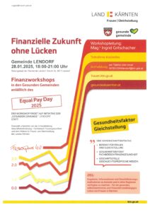 Die Gesunde Gemeinde Lendorf veranstaltet am 28. Jänner 2026 einen dreistündigen Workshop „Finanzielle Zukunft ohne Lücken“ für Mädchen und Frauen jeden Alters. Der Finanzworkshop vermittelt praxisnah, wie die eigene finanzielle Situation aktiv gestaltet und verbessert werden kann. Oft machen bereits kleine Veränderungen einen großen Unterschied für eine finanzielle Unabhängigkeit.